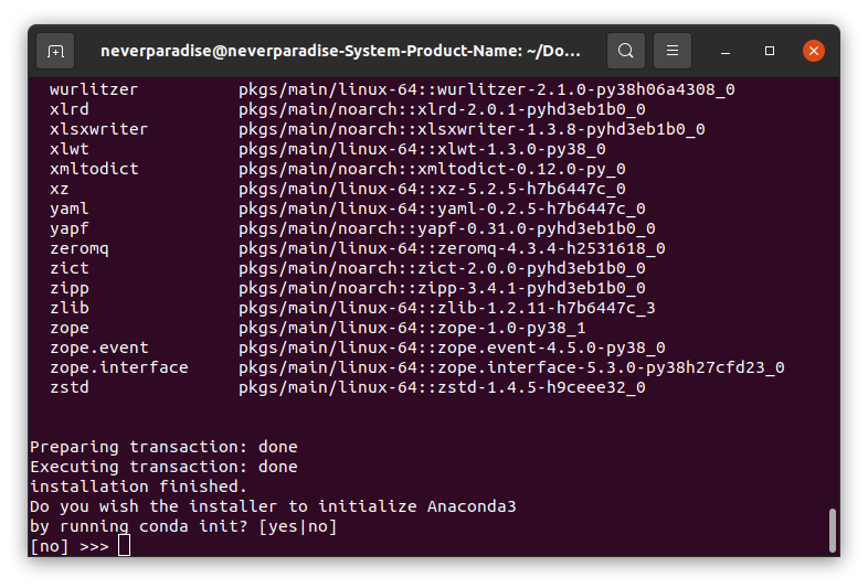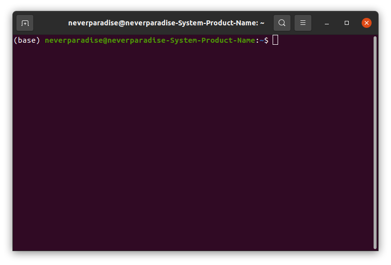 이제 터미널을 끈 후 다시 Ctrl + Alt + T 를 통해 실행하면 다음과 같이 base가 뜨게 됩니다.