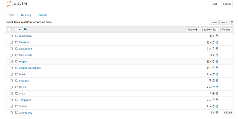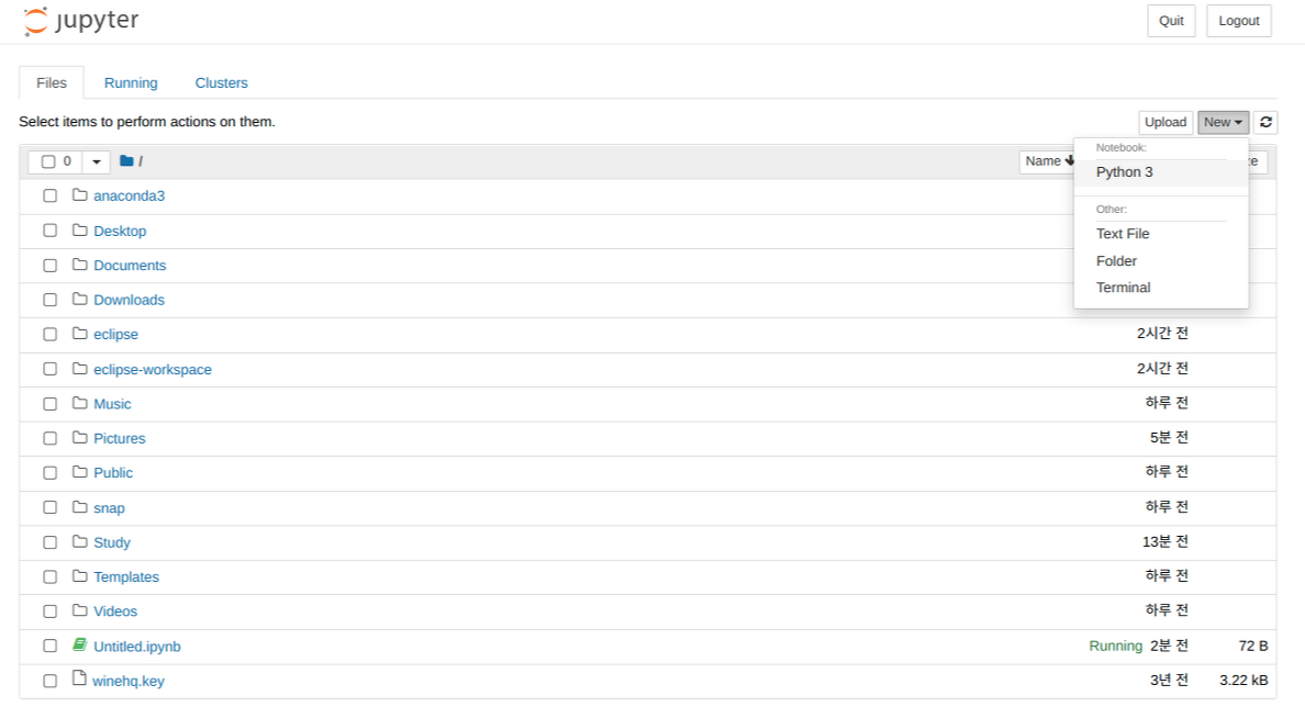 오른쪽 상단의 New를 눌러 Python 3를 선택하면 Untitled.ipynb라는 파일이 만들어집니다.