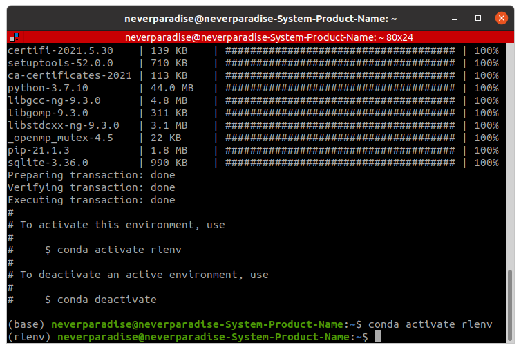 conda create -n rlenv python=3.7그 후, conda activate [환경이름]을 통해 가상환경을 활성화할 수 있습니다.
