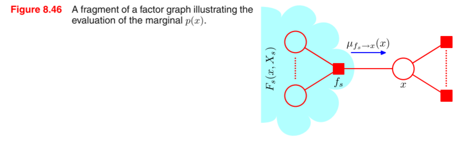 $x \backslashmathbf x$ 기호는 $x$를 제외한 모든 변수들을 지칭하는 것이다. 핵심 아이디어는 인자그래프 표현식을 사용해서 $p(\mathbf x)$를 치환하고, 그 후 덧셈과 곱셈들을 교환해서 효율적인 알고리즘을 구하는 것이다.