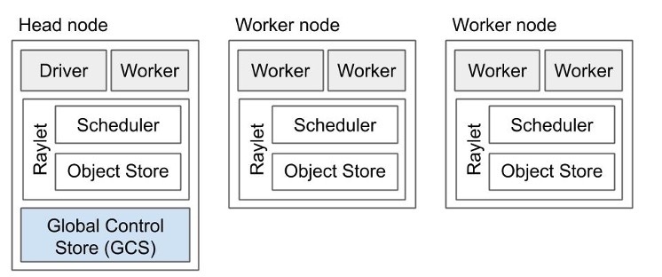 Figure: Head node 헤드 노드는 worker node의 모든 구성요소에 driver process와 global control store (GCS) 가 추가된 형태입니다.