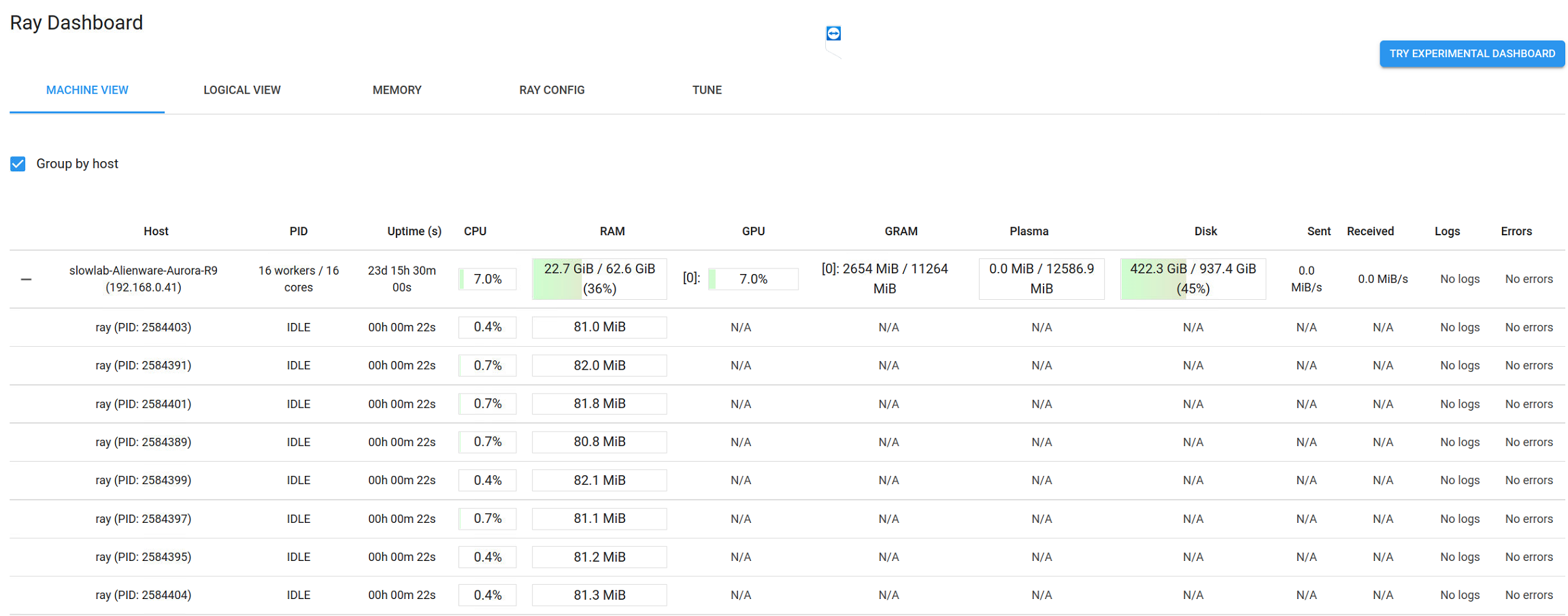 Figure: Ray Dashboard 그러면 위와 같은 Dashboard를 띄울 수 있습니다. 현재 시스템에서 리소스를 얼마나 사용하고 있는지 확인할 수 있습니다.