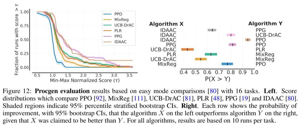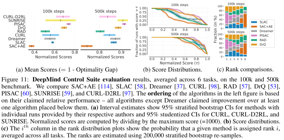- 결과의 가변성을 설명하고 더 강건하고 효율적은 metric 들을 표현하기 위해 performance profile 들을 제안한다. (interquartile mean scores). 필드에서 사용 가능한 오픈 소스 라이브러리 rliable 도 제안한다.