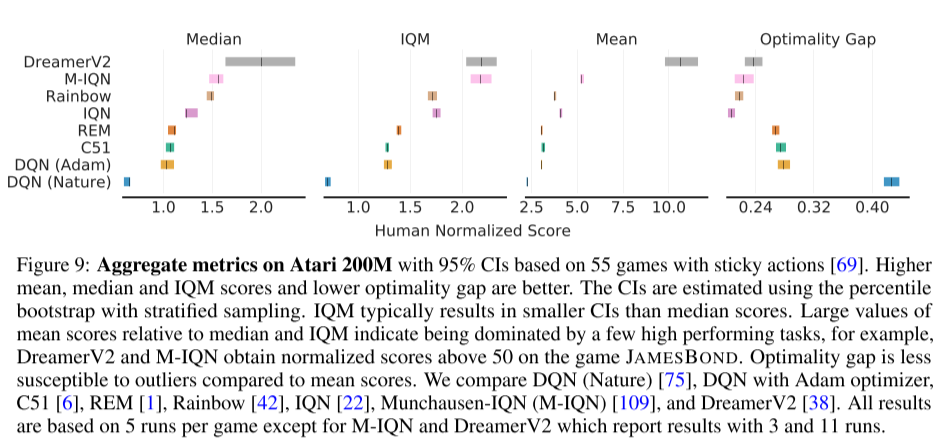 - Dreamer V2의 경우 집계된 점수에 상당한 불확실성을 보인다.
