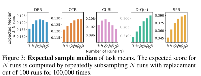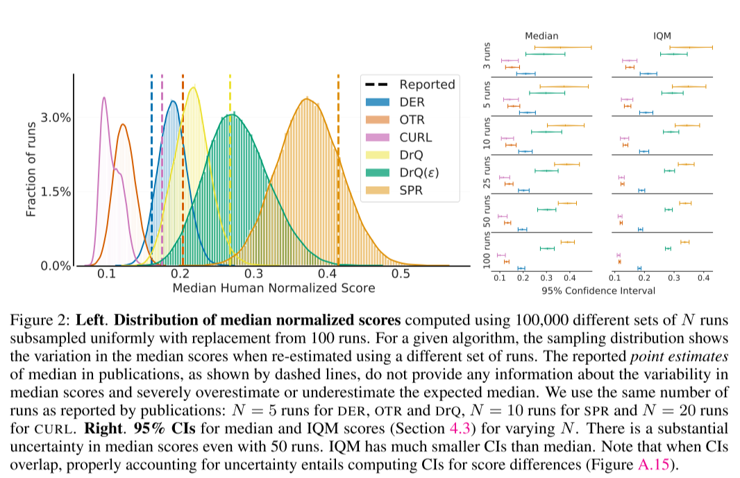 - 다양한 실행 횟수 (그림2 오른쪽)에 대한 샘플 중앙값에 대한 신뢰구간을 계산하면 이 수치가 아타리에서 50~100회의 실험 수행에 더 가까운 것을 볼 수 있다. 그러나 이는 대부분의 연구 프로젝트에서 실행하기에 너무 계산량이 많다.