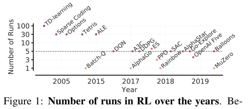 - 더 많이 실행하면 불확실성을 줄일 수 있지만 계산비용 때문에 제한이 있다. 예를 들어, standard protocol을 이용해서 50개가 넘는 아타리 2600 게임들을 5번을 실행하려면 1000개의 GPU로 며칠을 학습시켜야 한다.