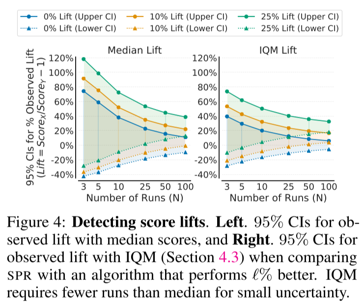 - 하나의 알고리즘이 더 낫다고 알려진 상황을 고려보자. 실행횟수를 다양하게 할 때, 성능 차이를 정확하게 평가하려면 Median과 IQM에 대한 신뢰도는 몇이 되어야할까?