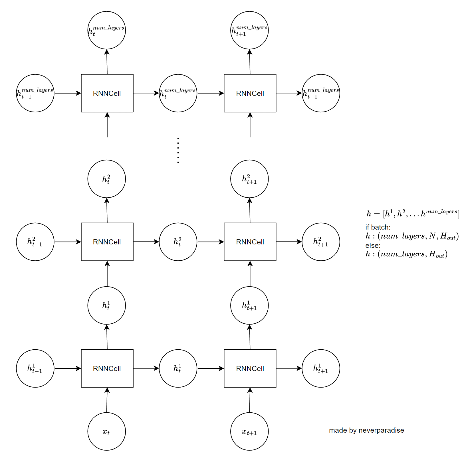 $output$의 경우 $(L, N, H_{out})$의 텐서가 출력되며, $h_t$의 경우 $(num\_ layers, N, H_{out})$ 형태의 텐서가 출력된다. 여기서 중요한 것은 RNNCell과 RNN의 차이이다. RNN은 RNNCell을 일반화한 것이다. 여러 개의 RNN Cell을 쌓아서 RNN을 만들 수 있다.