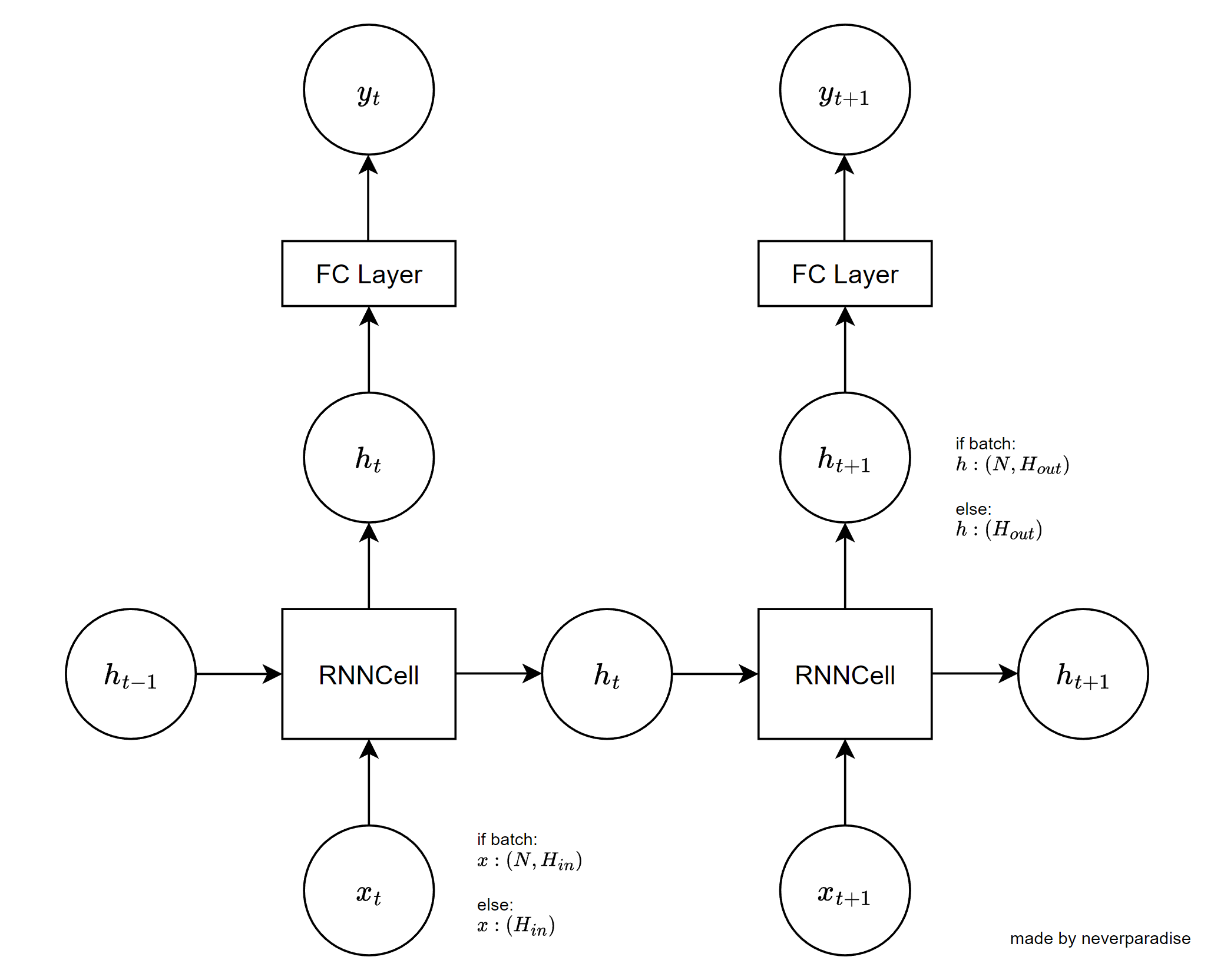 그림 2: RNN 그림 3: RNN Detail RNN은 $(L, H_{in})$ 또는 $(L, N, H_{in})$ 형태의 텐서를 입력받는데 *시퀀스를 한 번에 입력받는다.* 만약 batched tensor를 처리하고 싶다면 각 모든 시퀀스들을 길이 $L$로 맞춰줘야 한다. RNNCell의 경우 시퀀스 텐서의 한 timestep 값인 $(N, H_{in})$ 텐서를 입력받는다.