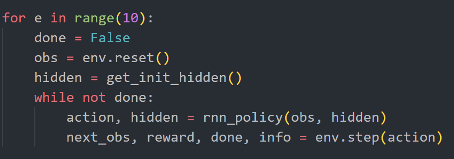 그림 4: RNN Value, Policy 이제 RNN으로 Value와 Policy를 매개변수화하는 상황을 생각해보자. 환경을 초기화 한다음, 값이 0으로 채워진 init_hidden_state를 만들고 policy에 넣어주면서 rollout을 하면 될 것 같다. 아래 그림에서는 hidden이 드러나게 pesudo code를 작성했지만, 실제 구현할 때는 hidden을 멤버변수로 선언해서 rollout 과정에서 드러나지 않게 할 것이다.
