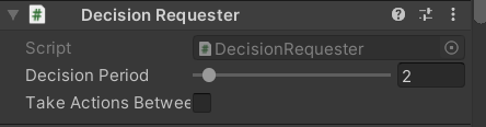 그림 : mlagent의 Decision Requester 컴포넌트 그림에서 Decision Period는 몇 번의 관측마다 행동을 할 것인지를 결정합니다. 값을 1로 정하면 매 번의 관측마다 행동을 하게 되므로 Noframeskip이 됩니다. Period 값을 2 이상으로 하면 이때, 각 Period 들에 대해서 행동을 할 지 말지를 결정할 수 있는데 체크를 하면 모든 timestep에 대해 행동을 하고 체크를 비우면 Period 값마다 행동을 취하게 됩니다.