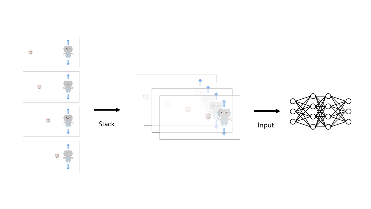 Frame stack은 이미지를 관측(Image Observation)으로 받는 환경에서 주로 사용되는 기술입니다. 단어 뜻 그대로 이미지를 쌓아서 인공신경망에 입력으로 주게 되는 것입니다. 물론 벡터 관측(Vector Ovservation)도 스택으로 쌓아서 입력으로 사용할 수 있습니다. 그렇다면 왜 프레임을 하나씩 인공신경망에 입력하는게 아니라 굳이 여러 개를 입력하게 되었을까요?