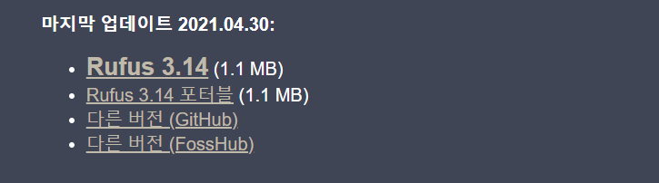 USB를 컴퓨터에 꼽아주시고 rufus라는 프로그램을 다운받습니다.