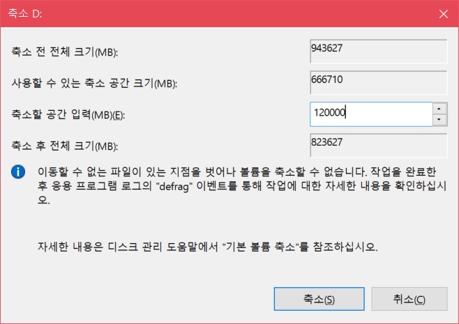 약 100GB의 용량을 확보하기 위해 120000을 써주고 축소 버튼을 누릅니다.