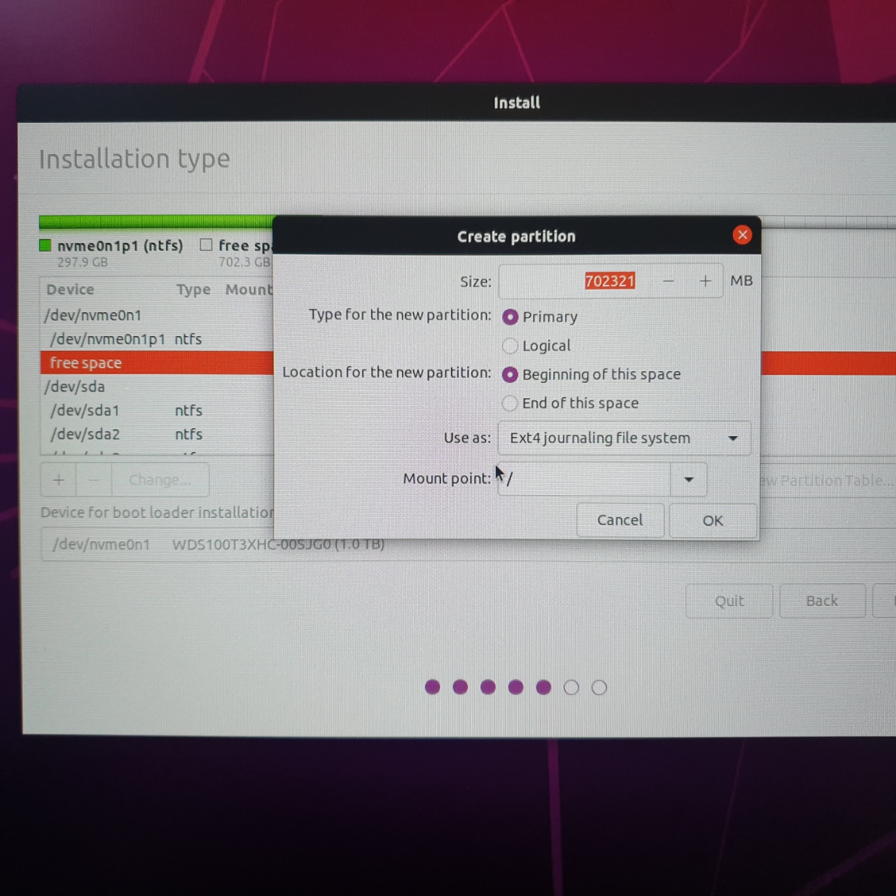 Install Ubuntu를 클릭합시다 English를 선택 후 Continue를 누릅니다 Normal Installation을 선택 후 아래의 Install third-party ~ 부분을 체크합니다. 그리고 Continue를 누릅니다. Something else를 체크한 후 Continue를 누릅니다. 여기서 120000MB Size인 Free space를 선택합니다. 그리고 + 버튼을 누릅니다. 저의 경우에는 우분투를 아예 개발환경으로 사용할 것이기 때문에 볼륨 축소를 다시해서 700GB로 맞추었습니다.